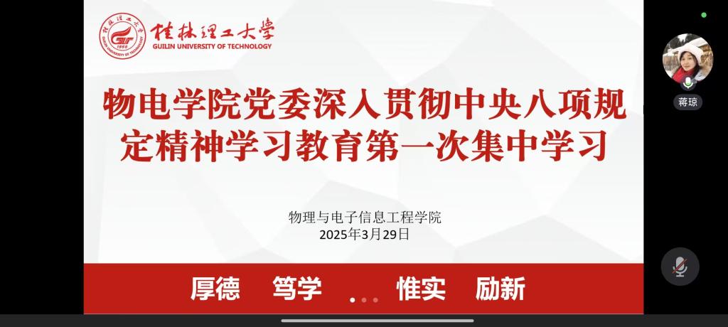 3月29日上午,bv伟德国际1946党委深入贯彻中央八项规定精神学习教育读书班通过腾讯线上会议正式开班。学院党委书记秦勤忠主持深入贯彻中央八项规定精神学习教育第一次集中学习,院长董明刚、党委副书记蒋琼分别作专题发言,学院领导班子成员、纪委委员及各基层党支部书记参加会议。 学院党委书记秦勤忠领学《中央八项规定》并作系统解读。指出中央八项规定作为新时代全面从严治党的重要制度遵循,要通过深化学习教育推动作风建设常态化长效化。他强调,学院党委应重点落实学习教育、自查自纠和监督检查三项举措,开展深入贯彻中央八项规定精神学习教育,推动党的作风建设持续向好。 董明刚院长结合习近平总书记在十八届中央纪委二次、三次全会上的重要讲话精神,深入阐释作风建设的长期性和重要性。他指出,要深入学习习近平总书记关于加强党的作风建设的重要论述,通过强化理论武装、开展案例警示教育、完善监督机制等方式,持续巩固学院风清气正的作风建设工作,确保中央八项规定精神落地生根。 蒋琼副书记重点传达中央党的建设工作领导小组会议精神,对学习班教育工作作出部署。她要求聚焦“学查改”一体推进,突出新提拔干部、年轻干部等重点群体分类指导。力戒形式主义,充分发挥学院各级党委对学院教育工作的责任制度和指导作用,通过坚持开门教育,完善制度规范、接受群众监督等举措,确保学习教育取得实效。 深入贯彻中央八项规定精神学习教育将通过党委理论学习中心组学习、专题党课、主题党日活动等多种形式持续进行。学院党委将以此次学习教育为契机,引导全体党员干部以高度政治自觉落实中央八项规定精神,以过硬作风推动学院各项工作再上新台阶。 会议图片 (一审:郭泉;二审:蒋琼;三审:秦勤忠)