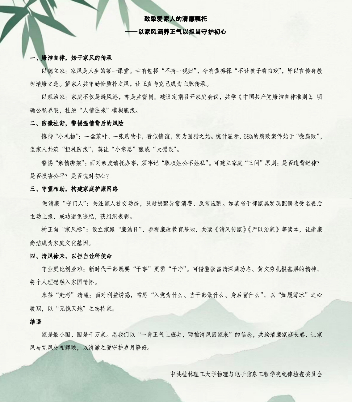 为扎实推进党风廉政建设,筑牢家庭廉洁防线,12月8日,bv伟德国际1946纪委组织领导干部家属及党员家属前往学校廉政文化园开展主题教育活动。 学院纪委书记蒋琼带领家属们依次参观了廉政文化园的多个主题展区,通过丰富的图文史料、典型案例和互动展示,深入了解党的纪律建设历程与廉洁文化传统。活动特别设置了“廉洁家书”展示环节。现场发放了《致挚爱家人的清廉嘱托》的廉洁家书。家书中强调“以德立家、以规治家”,倡导勤俭质朴、克己正直的家风传承;提醒家属“防微杜渐”,警惕“小礼物”“亲情绑架”等潜在风险;鼓励家庭成员相互监督,当好清廉“守门人”,共同构建家庭护廉网络,并以“一身正气上班去,两袖清风回家来”共勉,凝聚廉洁齐家的共识与力量。 学院纪委书记蒋琼在总结中强调,家庭是反腐倡廉的重要阵地,希望家属们常吹“廉洁风”,当好“廉内助”,共同营造崇廉尚洁的家庭氛围,以良好家风助力学院风清气正政治生态的巩固与发展。此次活动通过沉浸式教育与亲情化倡导相结合的形式,进一步增强了党员干部及其家属的纪律意识与廉洁观念。 现场图片(一) 现场图片(二) 廉洁家书 (一审:夏琳,二审:蒋琼,三审:秦勤忠)