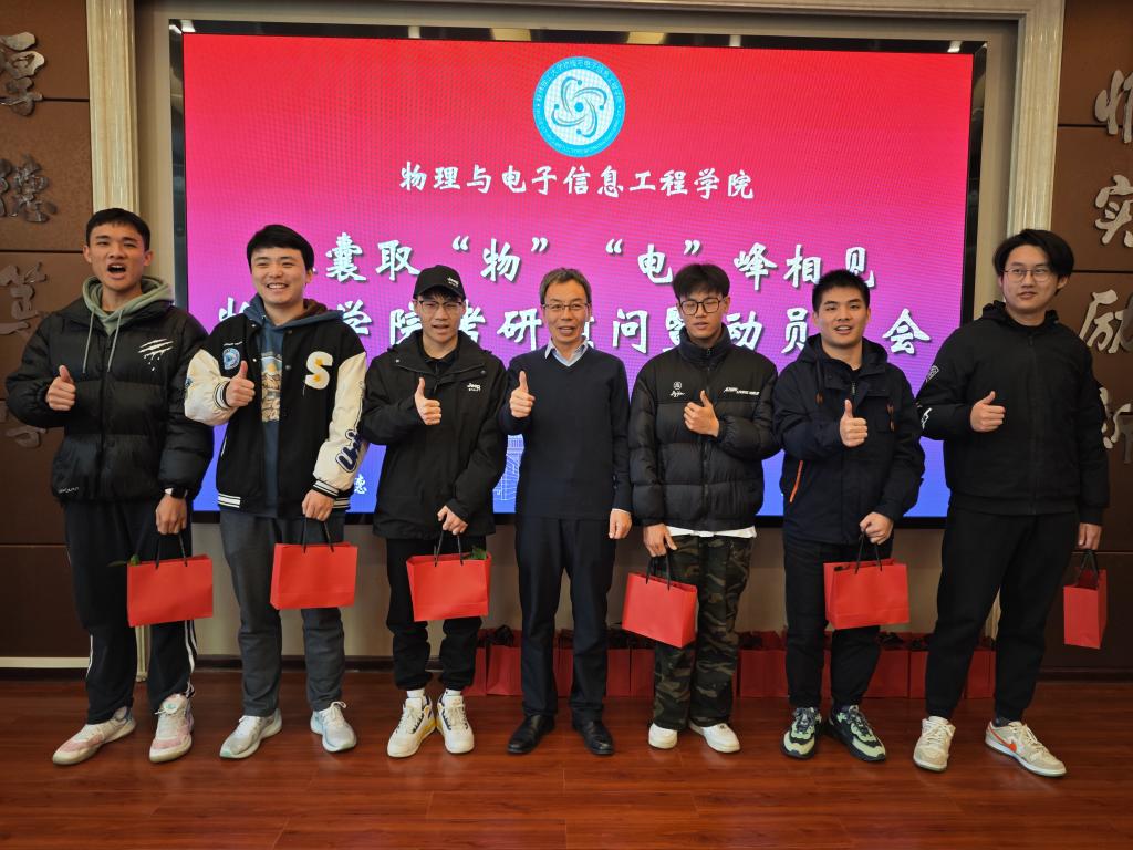 会上,秦勤忠书记动员同学们从自身出发,认识到考研对今后学习、生活的重大影响,希望同学们积极主动地学习和迎接考试,并传达了学院全体老师对考研学子的关心、慰问和期盼。秦勤忠书记表示,学院领导、老师会尽全力切实解决同学们备考过程中遇到的困难与诉求。董明刚副院长为考研学子送上祝福,提醒考研学生在学习的同时注意身体健康,做好作息时间调整和压力释放,以最好的状态迎接考试,希望同学们充满信心,积极应考,坚持到底,成功上岸。会后,学院领导为考研学子发放了精心准备的“考研大礼包”,既有祝愿考研成功的贺卡,又有寓意“士气满满”的士力架、“身体健康”的旺仔牛奶、“心想事成”的柿子和橙子,为考研学生送去美好的祝愿。