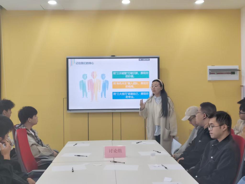 活动旨在帮助学生突破沟通障碍与自我设限,掌握团队协作技巧。在赋能讲堂环节,主讲人姚倩老师系统解析了无领导小组面试的核心要点与实用技巧。实战模拟环节高度还原真实面试场景。学员们分组完成从审题、个人陈述到自由讨论、总结陈词的全流程。现场计时严格,观察团成员近距离观察,营造出真实的面试氛围。在复盘点睛阶段,观摩小组进行针对性互评,提出建议。这种多维反馈机制帮助同学们将实战体验转化为系统经验。