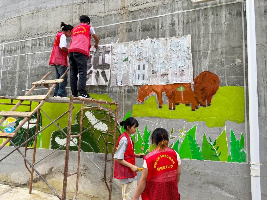 同绘时代新图景,共筑民族团结魂。“青春飞扬心向党,浓墨重彩绘振兴”民族团结实践团来到了百色市靖西市安德镇三西村,用画笔绘出了心中那幅乡村振兴、民族团结的时代画卷。他们在墙绘设计中融入了三西村悠久的竹编手艺、桑蚕产业等元素,展现村子深厚的历史人文风貌和传统工艺魅力,提升当地居民对本土文化的认同和传承意识,当好民族团结进步的宣传者、示范者和践行者。墙绘之余,实践团成员深入村户调研,一边帮着干农活儿一边听着村民讲述村子一步一步发展振兴的故事。青障叠翠,群山环绕,边城壮乡的古村落带给实践团成员太多的记忆和收获。村支书频频竖起大拇指说:“这群大学生能吃苦、肯奋斗,我们希望他们每年都能来。”