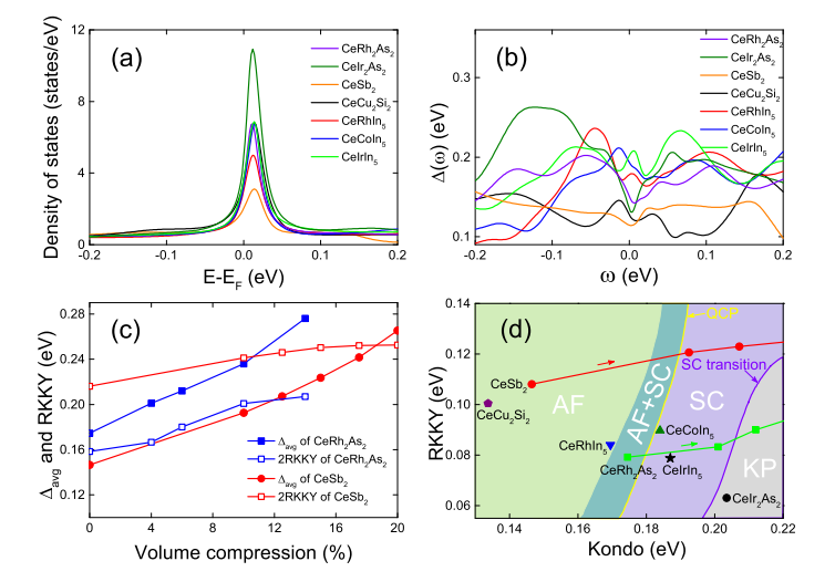 研究工作一中对于多种典型的铈基重费米子超导材料,通过密度泛函理论结合动力学平均场理论(DFT+DMFT)计算,并通过拟合其有效模型参数,深入探讨了压力对其物相演化的影响。理论计算结果成功解释了实验上观测到的反铁磁量子临界点的存在,并解释了这些铈基超导材料在常压下的物相,以及压力增强时的相变过程。研究工作二则预言了一种由非点式对称性保护的相互作用型拓扑半金属CePt2Si2。通过DFT+DMFT计算得出,CePt2Si2在近藤相干温度以下会形成由重费米子组成的狄拉克节线,而在高于近藤屏蔽温度时,该狄拉克节线则变为由轻传导电子组成的非相互作用状态。这两篇论文为理解重费米子材料中的奇异物理行为提供了重要的理论依据。