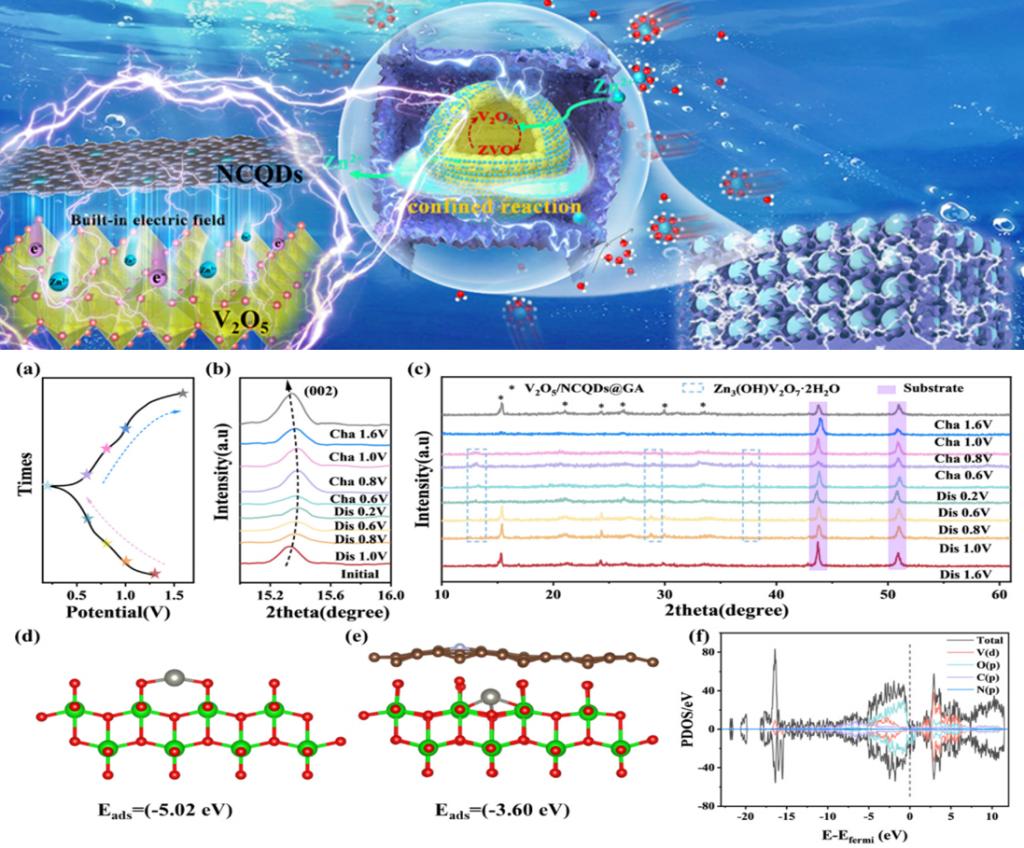 该研究提出“异质界面-分级限域”协同策略,通过原位化学键合将氮掺杂碳量子点(NCQDs)锚定于V₂O₅纳米颗粒表面,构筑具有内建电场的离散异质单元,并进一步将其嵌入三维石墨烯气凝胶(GA)的“笼”式框架中,形成一体化正极(V₂O₅/NCQDs@GA)。内建电场可显著降低Zn²⁺扩散势垒并激活体相活性位,而GA的分级限域网络则有效抑制钒溶解、缓冲体积膨胀,并实现电子/离子快速传输。
