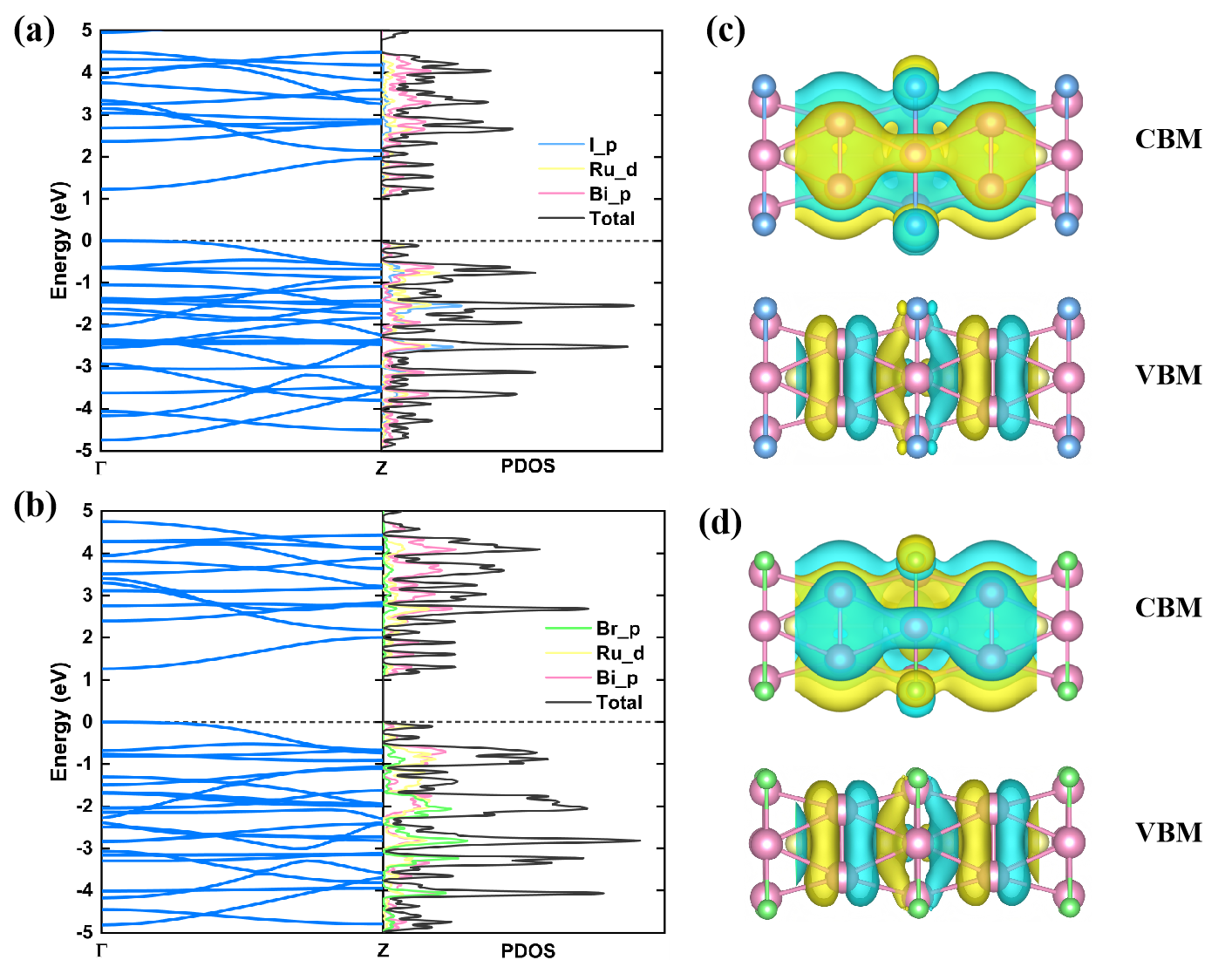 (a)和(b)为一维Bi4RuI2和Bi4RuBr2的能带结构及相应的投影态密度(PDOS)。(c)和(d)分别为一维Bi4RuI2和Bi4RuBr2的导带底(CBM)和价带顶(VBM)的实空间波函数