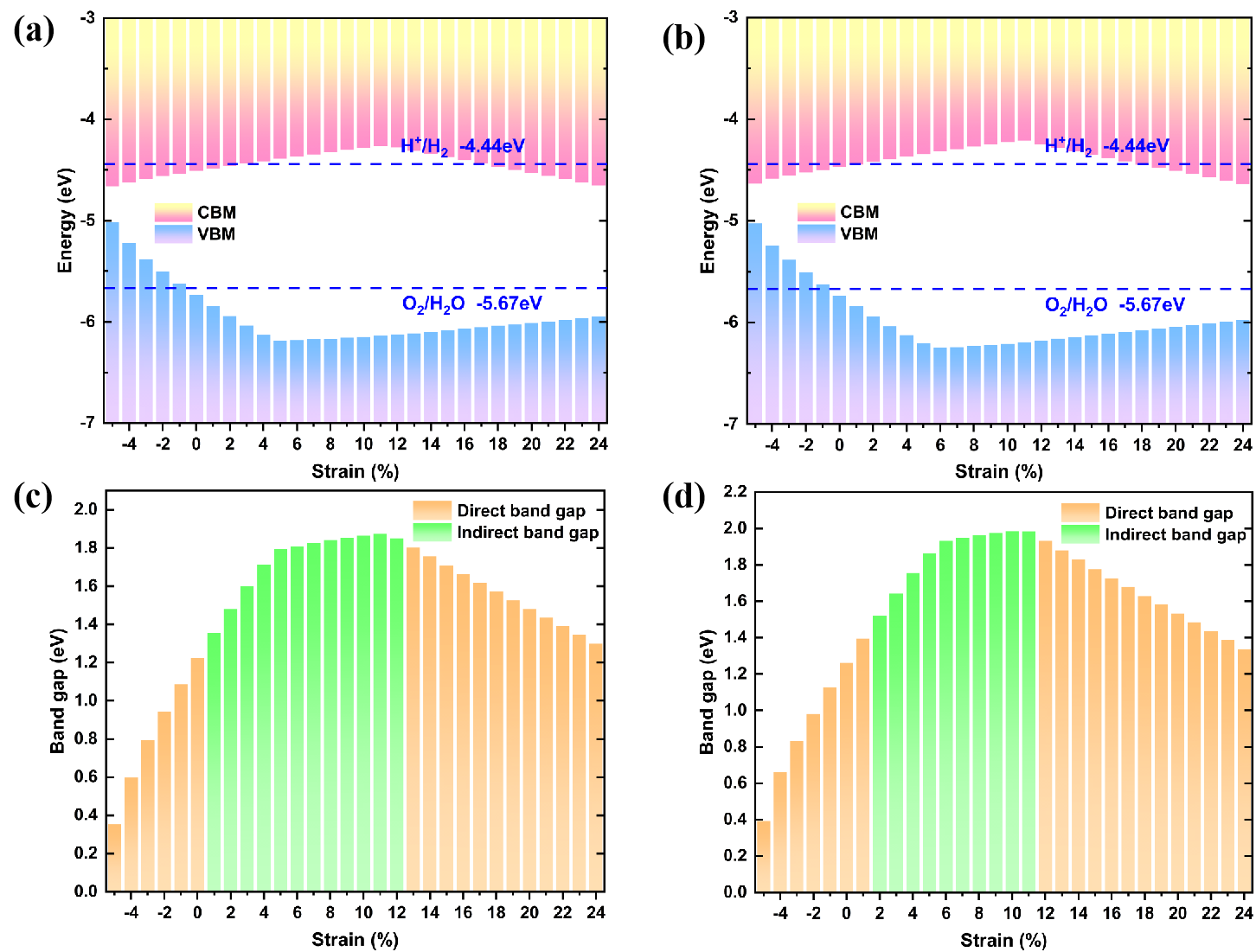 (a)和(b)为一维Bi4RuI2和Bi4RuBr2的带边位置随单轴应变的变化,(c)和(d)为一维Bi4RuI2和Bi4RuBr2的带隙随单轴应变的演变