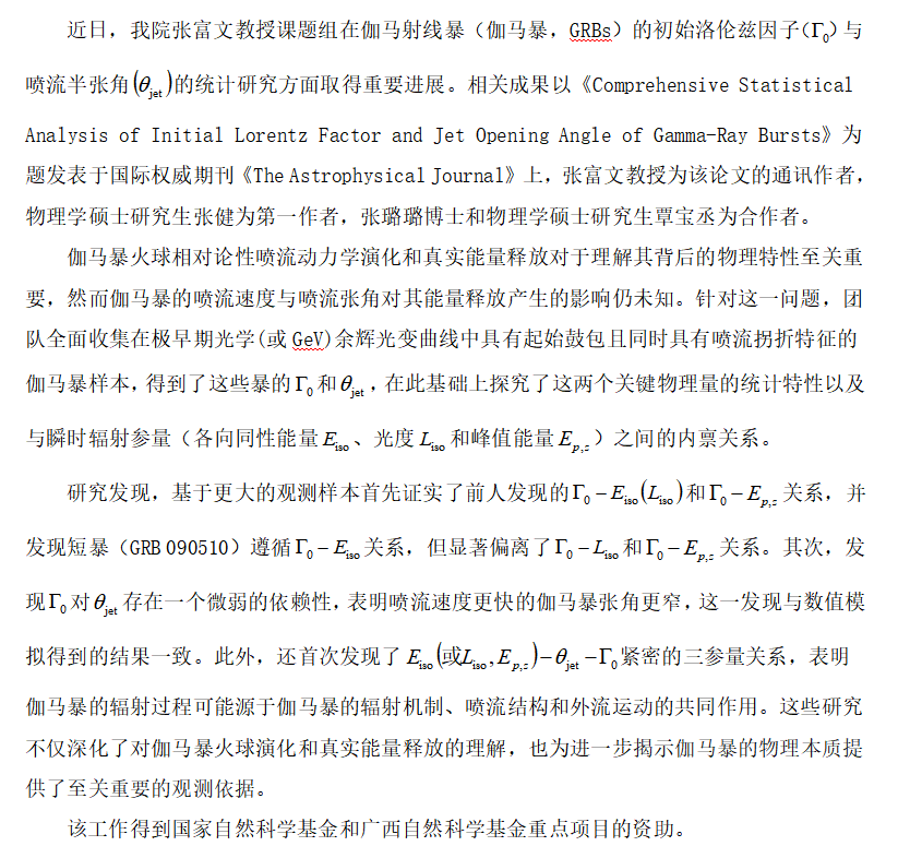 我院张富文教授团队在《The Astrophysical Journal》发表伽马射线暴研究领域最新研究成果